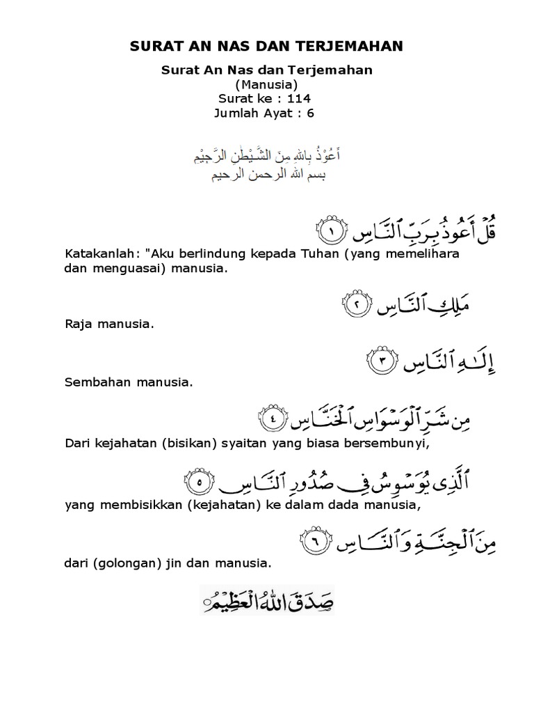 Quran recitation by abdul hadi kanakeri, english translation of the quran by yusuf ali and tafsir by sayyid abul ala maududi. Ia adalah doa 6 ayat ringkas, meminta kepada allah untuk perlindungan dari syaitan. See who else is singing surah an nas dan terjemahan. Langsung saja kita simak berikut ini. Assalammualaikum wbt selawat salam ke atas junjungan baginda s.a.w untuk mendengar 114 surah 30 juzuk lengkap sila layari web.